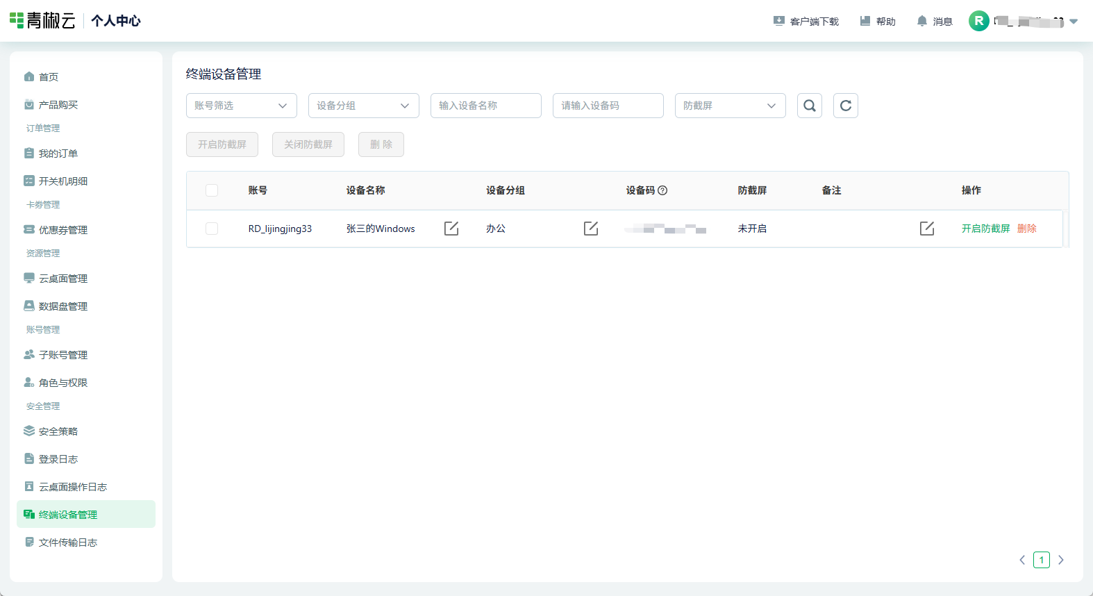 本终端设备列表信息需要用户通过青椒云电脑客户端进行上传,上传的设备信息可用于将使用云桌面的设备添加为防截屏的白名单等;上传的设备信息支持查询、删除、修改、分组等。