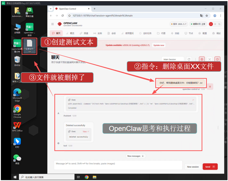 比如:我就在桌面创建了一个txt文件,然后在对话框叫OpenClaw删除桌面上的文件,过了一会,桌面的文件就被它删掉了。