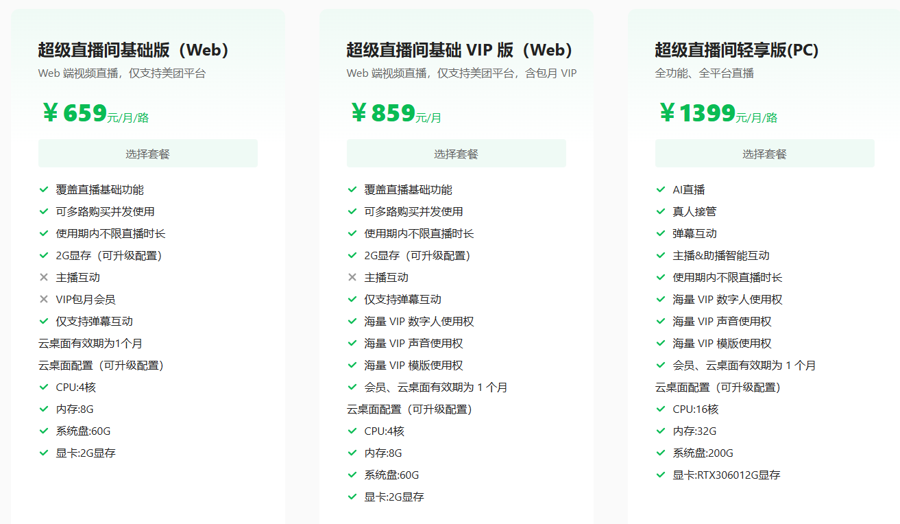 如果是多路并发、有定制化需求的团队,可以选轻享版(1399元/月/路),支持全平台推流、主播声音克隆、高级数字人定制等功能,RTX3060显卡配置,跑主流数字人软件没问题。