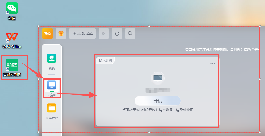 点击开机,就能控制云桌面。相当于在本地桌面,远程控制一台云端的电脑。