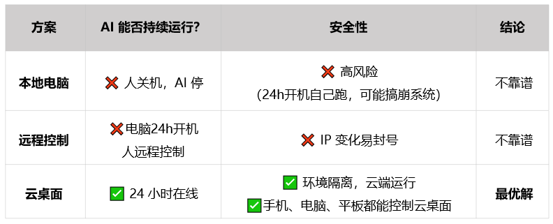 让 AI Coding直接跑在本地电脑上不靠谱,用手机直连 AI Coding风险高,容易被封。所以,最稳妥的方式,是把 Claude Code 放在云桌面上跑。